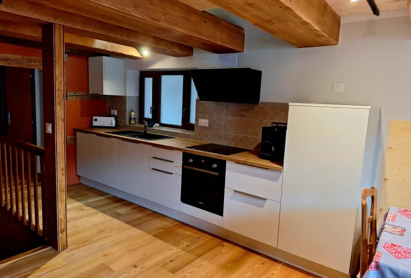 • eine Küche (offen zum Wohnzimmer), ausgestattet mit Backofen, Mikrowelle, Cerankochfeld, Kühlschrank, Kaffeemaschine und Toaster