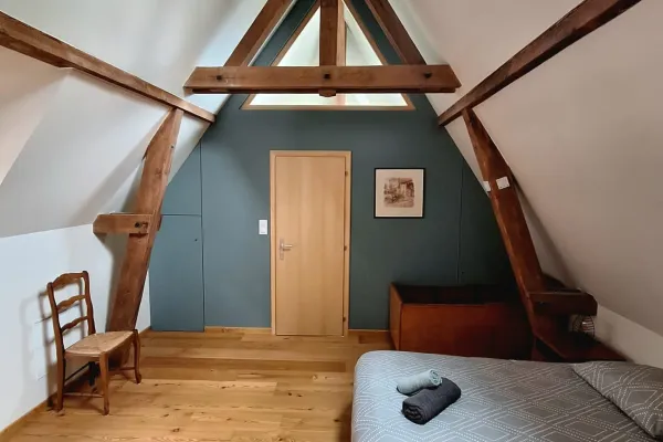 Diese Unterkunft befindet sich im ersten Stock des alten Familienhauses, das vom fünffachen Urgroßvater von Pierre-Yves gebaut wurde. Sie gehen die Treppe zum Eingang hinauf, um in den Wohnraum zu gelangen, der aus einer offenen Küche, einem Essbereich und einem ersten Wohnbereich mit Fernseher besteht.