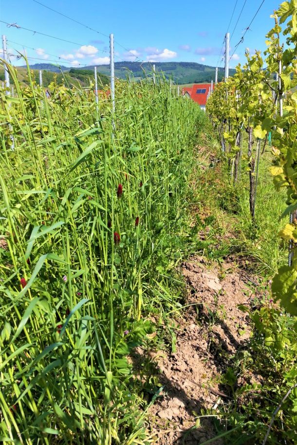 Nous semons des céréales pour créer un paillis et conserver de l’eau et de la fraîcheur dans nos sols en été ; nous semons des légumineuses en automne pour stocker de l’azote qui, faute de quoi, serait perdu, pour pouvoir le restituer l’année suivante à la vigne, lorsqu’elle recommencera à pousser.