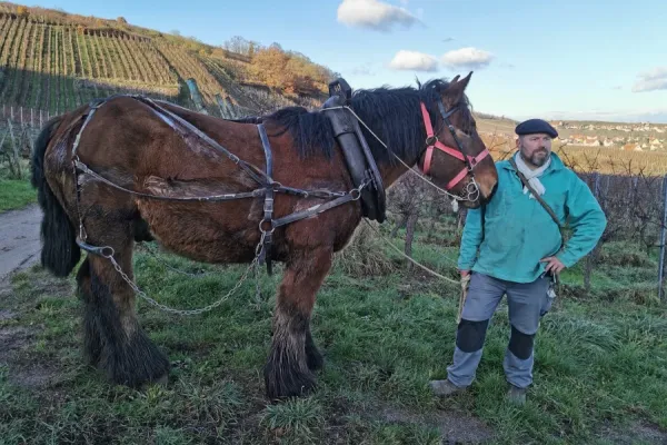 C’est grâce à la précieuse collaboration de Nicolas et Luc nos salariés, toujours prêts à nous épauler, que Pierre-Yves peut concilier sa passion pour les chevaux et ses responsabilités au sein du domaine. Début décembre, les formateurs Cécile et Pierre Simler de la Ferme Ebba d’Albé, sont revenus pour accompagner Pierre-Yves et Koko dans leur évolution. Koko est non seulement un excellent travailleur, mais aussi un compagnon fidèle qui apporte une touche de poésie à notre quotidien, c’est un vrai plaisir pour Pierre-Yves de faire équipe avec lui.